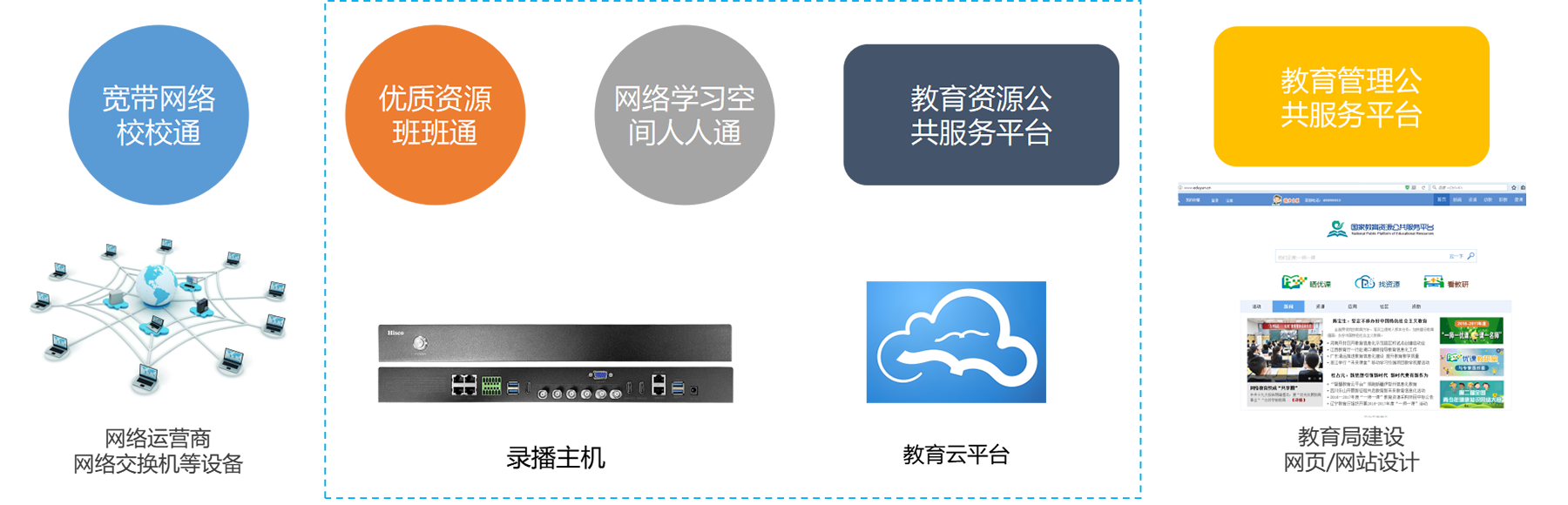 Hisco对国家政策-“推进数字化校园建设”以及“三通两平台”中教育技术与信息技术进行了深度融合的指导思想、深刻的理解,推出教育云平台系统解决方案。