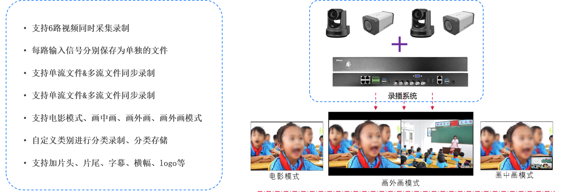 是通过摄像机和话筒将教室的视频(教师画面、学生画面、教学电脑PPT 、黑板)和音频(老师讲课语音、学生回答提问语音)采集后,录制生成视频文件存储下来,后期通过电脑登陆后点播视频文件播放或下载视频文件到本地播放,是一套实时的教学音视频存储记录设备。