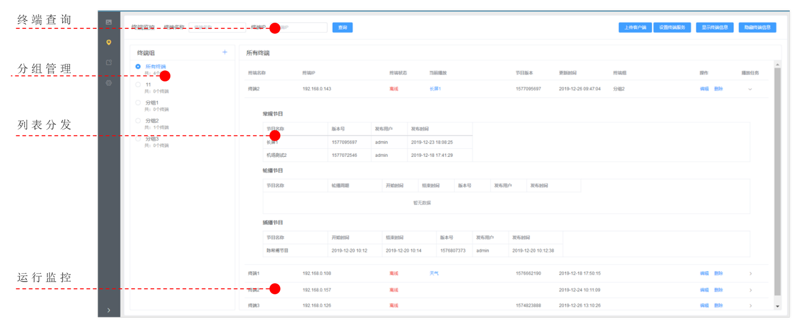 • 支持对信息发布终端进行分组归类,不同组播放不同的内容,相同组内终端播放内容一样。