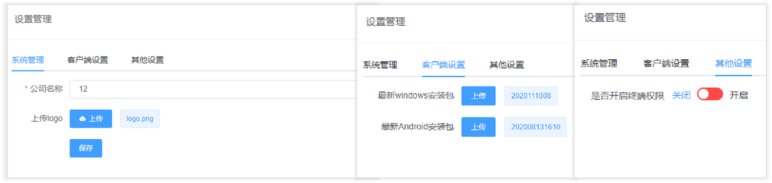 系统设置具备系统级的控制管理设置.具备系统LOGO、公司名称的设置;客户端安装包的上传远程更新;节目审批设置;终端权限设置等。