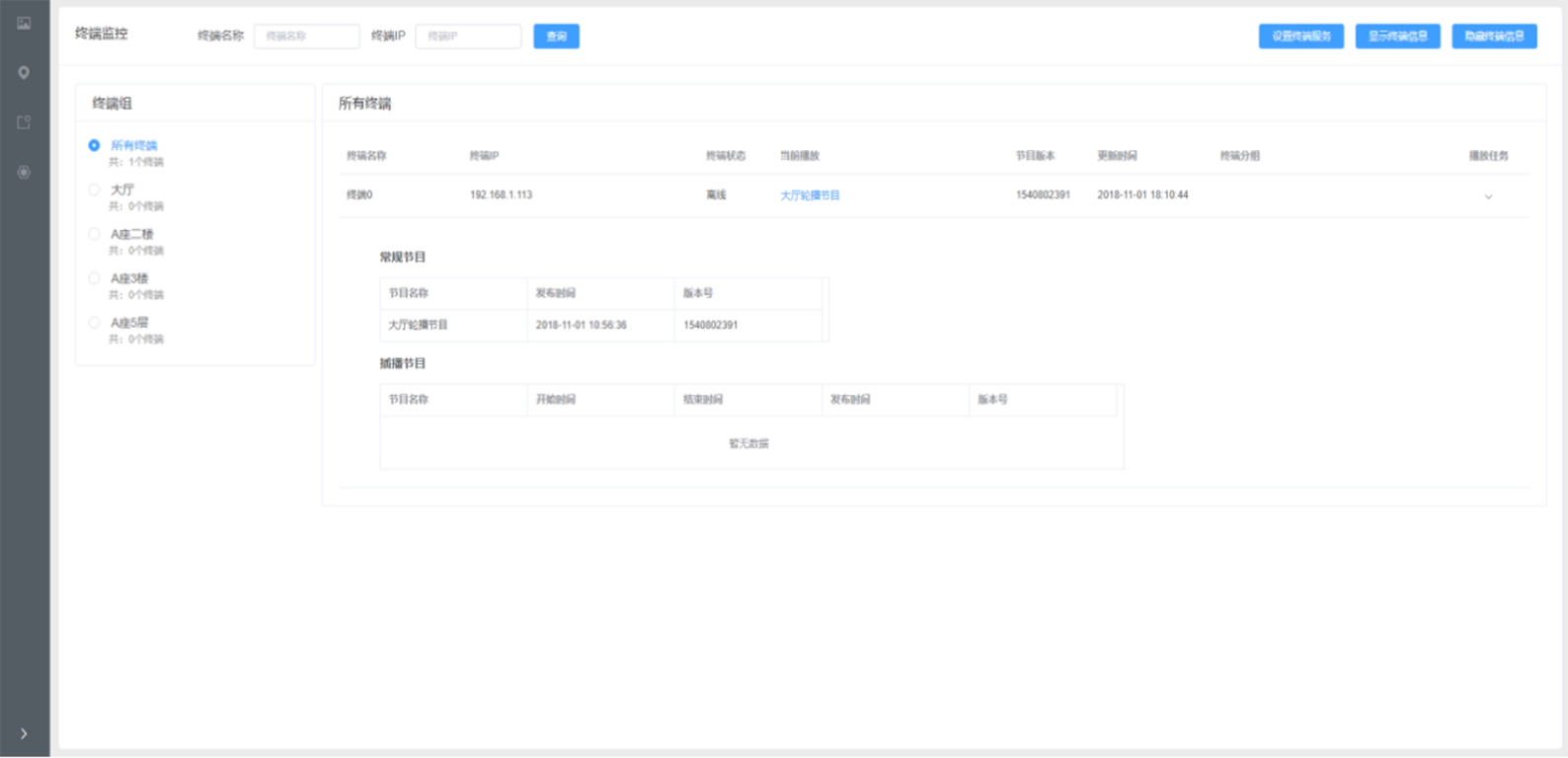 终端管理功能模块主要实现在文件发布的时候对播放终端的控制和管理,包括对同一个系统中不同的显示设备类型的设置管理,可以以组的方式实现终端的同步和异步播放。