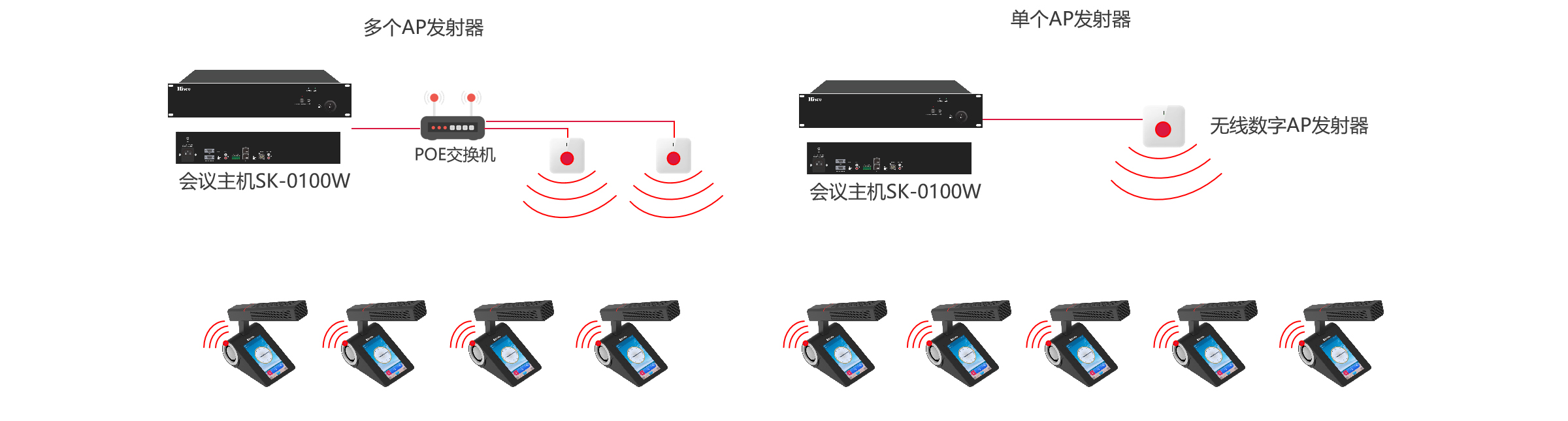 传统有线手拉手会议系统,需要延长线从主机房拉到会议室,一般需要做挖线槽,施工起来难度大;每个坐席的单元都是固定位置;维护起来不方便。